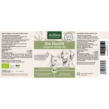 AniForte Bio Hanföl ist ein fettes Pflanzenöl, das aus den Samen des Nutzhanfs (Cannabis sativa) hergestellt wird. Daher enthält es auch keine berauschenden Stoffe, die das Nervensystem beeinträchtigen. Hanföl ist hoch bioverfügbar und weist einen hohen Gehalt an essentiellen Fettsäuren, wie z.B. Linolsäure (Omega-6) und α-(alpha-)Linolensäure (Omega-3) auf. Linolsäure ist an einer Vielzahl von biologischen Funktionen beteiligt und spielt eine wichtige Rolle beim Zellwachstum, Immunsystem und der Reproduktion. Zudem unterstützen essentielle Fettsäuren die normale Entwicklung der Haut. Die Verwendung von Hanfprodukten hat sich vor allem zur Erhaltung des Immunsystems und der Gelenkfunktion bei Tieren bewährt.