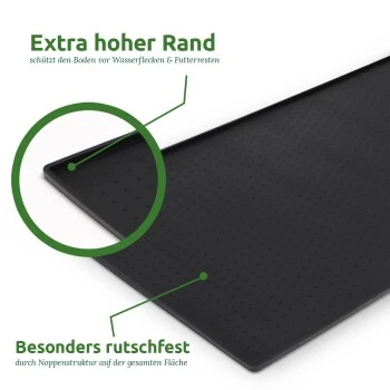 Die Futterunterlage besteht aus biegsamem, langlebigen und 100 % lebensmittelechtem Silikon. Die Oberfläche ist besonders rutschfest durch die dort befindliche Noppenstruktur und besitzt durch den extra hohen Rand einen Auslaufschutz. So gehören Wasserflecken und Futterreste der Vergangenheit an. Zudem ist sie wasserdicht und entsprechend sehr leicht zu reinigen.