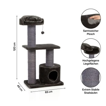 Mit ausreichend Platz und verschiedenen Spiel- und Kratzflächen, bietet diese Kratzbaum-Serie das ultimative Katzenparadies. Prima spielen, verstecken, aber auch sich zurückziehen und schlummern lässt es sich in den zwei kuscheligen Häuschen. Den Abschluss bildet das turmhohe, riesige und gemütliche Liegebett mit mit einem Durchmesser von 41 cm. Von dort aus hat Ihre Samtpfote alles im Blick und kann hervorragend sein Revier beobachten. Das Kuschelhäuschen am Boden des Katzenbaums lädt zum kuscheln ein und beinhaltet ein kuschliges Kissen und kann bei Verschmutzung unkompliziert und schnell gereinigt werden. Ihr Stubentiger kann in der Zwischenzeit die beidseitig bezogene und weich gepolsterte Liegeplatte auch ohne das Kuschelbettchen in Anspruch nehmen.