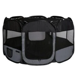 Mit den Maßen Ø 110 cm und 64 cm Höhe und kleinen Details wie Seitentaschen zum Verstauen von Zubehör erhalten Sie einen fantastischen Tierlaufstall für zuhause und unterwegs.